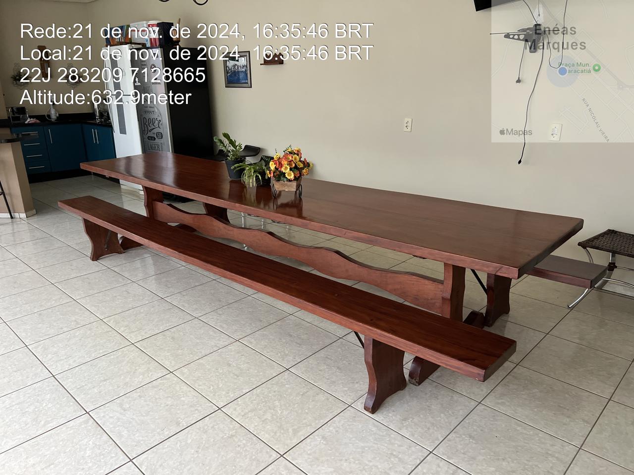 UMA MESA DE MADEIRA NOBRE, COM APROXIMADAMENTE 04 METROS DE COMPRIMENTO COM 02 BANCOS.