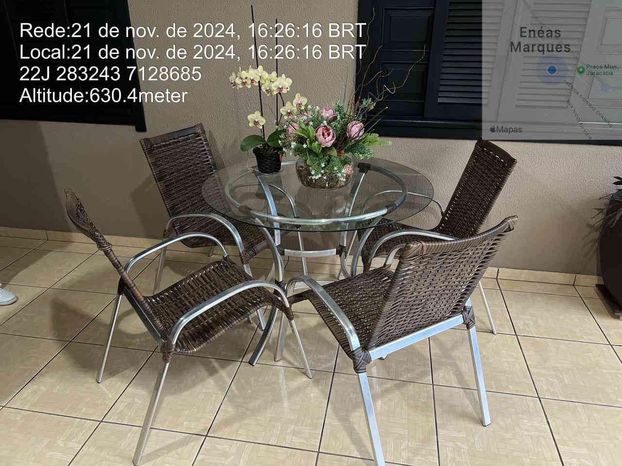 UMA MESA REDONDA COM TAMPO DE VIDRO E QUATRO CADEIRAS.