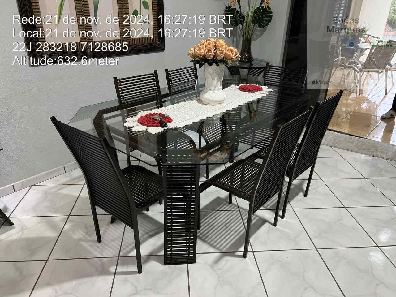 UMA MESA COM TAMPO DE VIDRO E SEIS CADEIRAS DE FERRO.